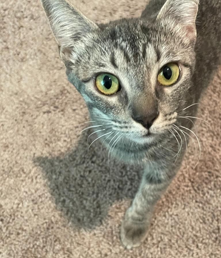 Chloe is a soft tabby girl with all the charm and spark of a kitten, wrapped up in a petite adolescent body. She recently lost her human and had a rough transition, but she’s ready to start fresh with a family of her own. Chloe lives right on that sweet in-between stage of kittenhood and adulthood. One moment she’s batting toys around or engaging with other kittens, and the next she’s perfectly content doing her own thing. She’s curious, playful, and full of energy, and once she feels comfortable, she truly enjoys affection–pets, attention, and being close to her people. Like many cats, Chloe is good at communicating her boundaries and may let you know when she’s had enough, so she’d do best in a home without very young children, or with people who understand and respect feline cues.